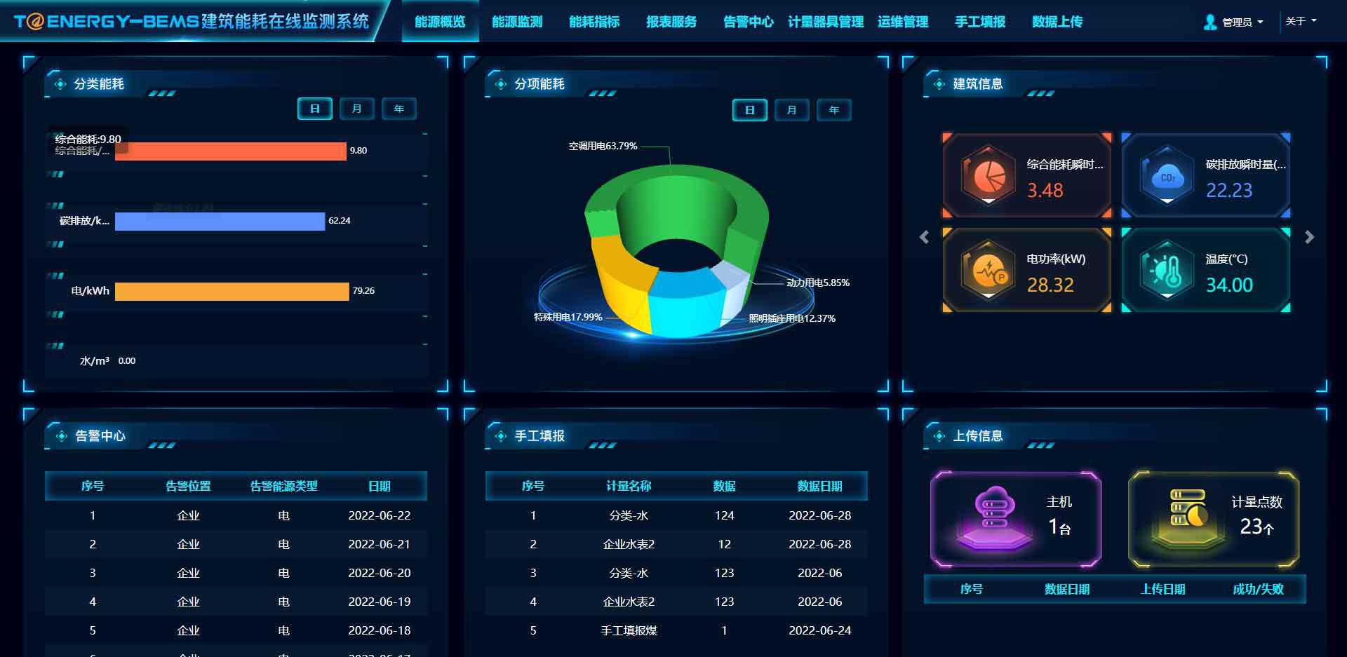 平臺通過各類智能計(jì)量儀表在線監(jiān)測建筑內(nèi)電、冷、水、熱等各項(xiàng)能耗數(shù)據(jù),將各項(xiàng)數(shù)據(jù)以表格、曲線和圖形等形式在各級終端展示,實(shí)現(xiàn)對各個(gè)用能環(huán)節(jié)的實(shí)時(shí)監(jiān)測以及能耗數(shù)據(jù)的分類、分項(xiàng)、分區(qū)統(tǒng)計(jì),保證數(shù)據(jù)源頭的可靠性,為建筑用能的精細(xì)化管理提供依據(jù)。
