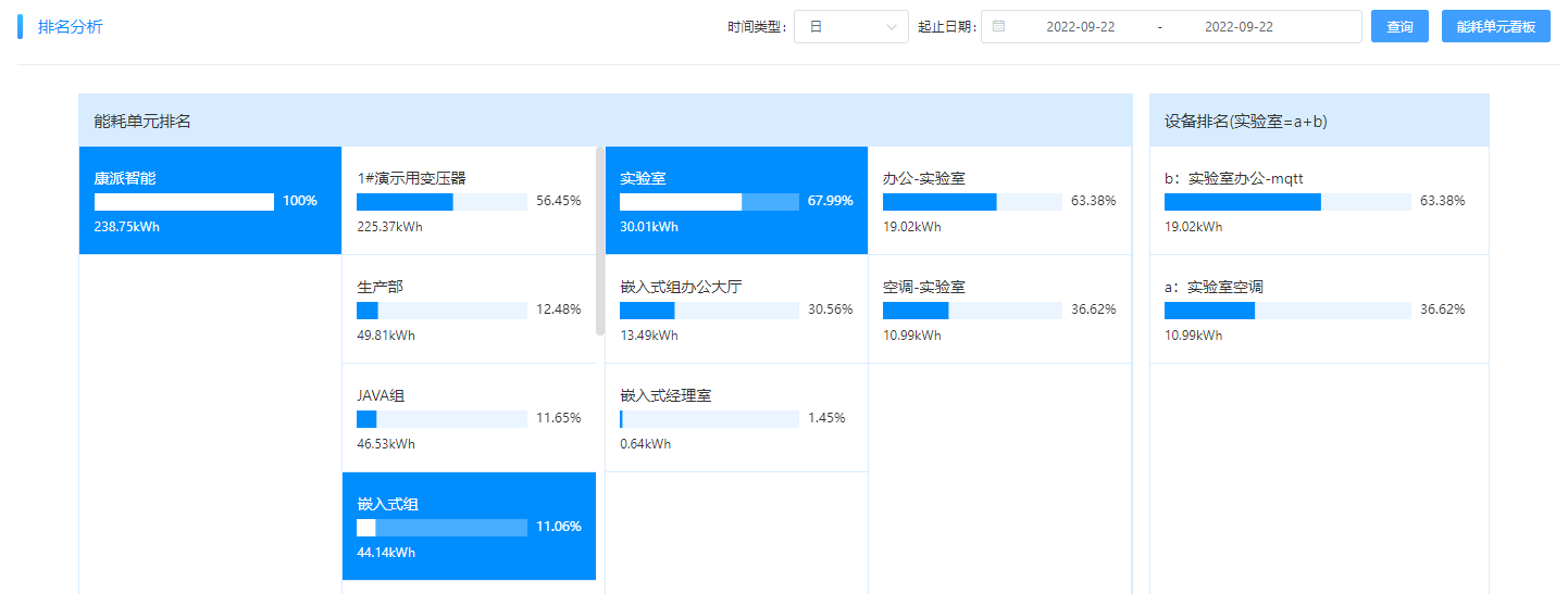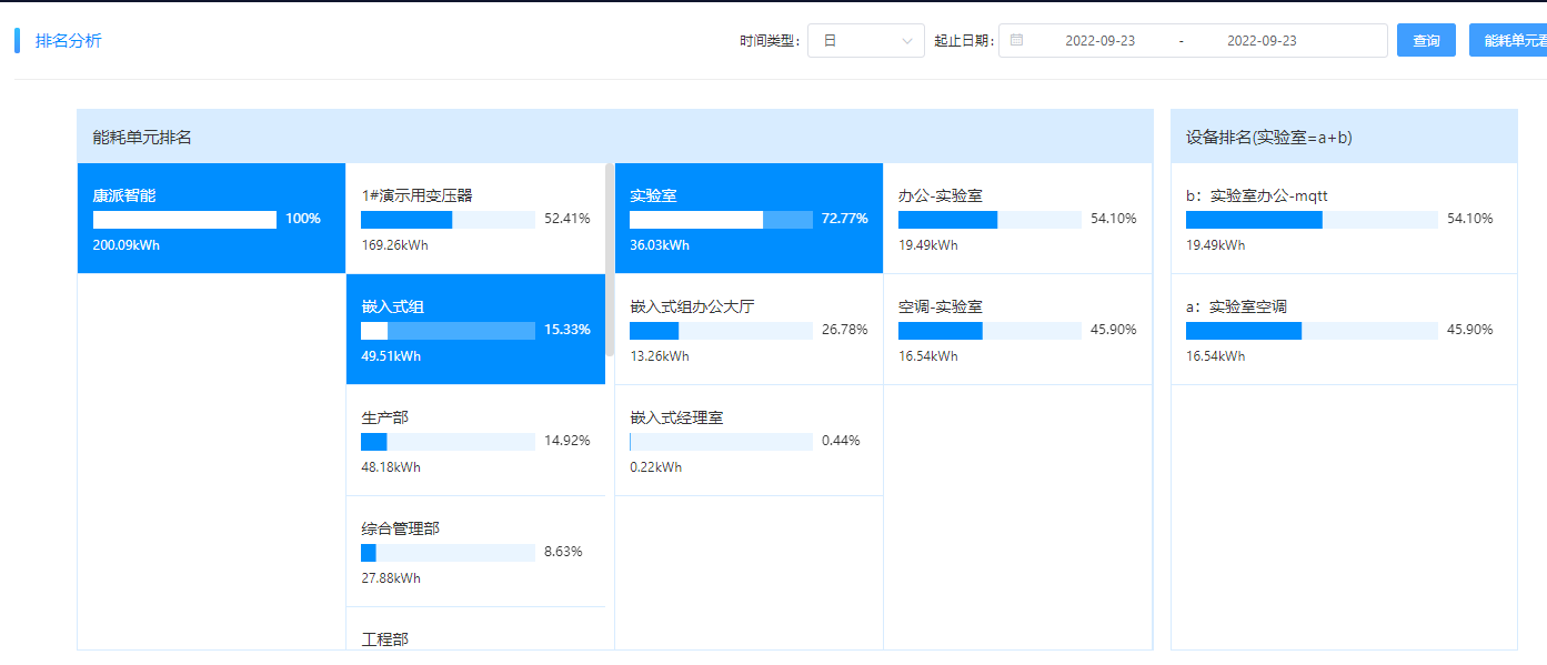 沿途索驥。通過(guò)前后兩天的能耗排名變化,確定異常用能部門(mén)。嵌入式組的用電排名,22號(hào)在第4位,23號(hào)升到第二位,多出了5kWh左右。通過(guò)對(duì)嵌入式組下一級(jí)的能耗對(duì)比發(fā)現(xiàn)為實(shí)驗(yàn)室用能比前一天多了6kWh左右,再進(jìn)一步對(duì)實(shí)驗(yàn)室的下一級(jí)能耗分析,發(fā)現(xiàn)為實(shí)驗(yàn)室空調(diào)比前一日多了6kWh??梢猿醪酱_認(rèn)是實(shí)驗(yàn)室的空調(diào)在非工作時(shí)間沒(méi)有關(guān)機(jī)。