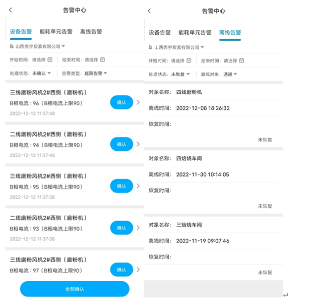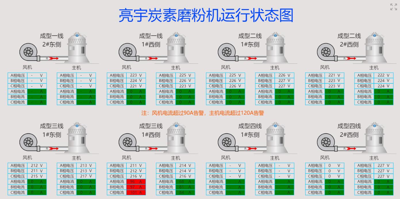設備層面:建設對磨粉機設備的運行狀態(tài)的監(jiān)測,通過對磨粉機電機的電壓電流監(jiān)測,判斷設備的運行健康狀態(tài),做到電機電流的越限報警。