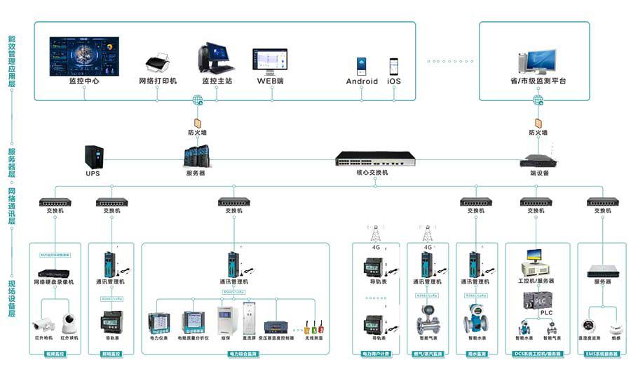 T@Energy智慧能源管理系統(tǒng)架構包括能效管理層、網(wǎng)絡通訊層、現(xiàn)場設備層三層架構。本方案結合網(wǎng)絡通訊、數(shù)據(jù)庫產(chǎn)品和技術建立一套先進的、符合非金屬礦物制品業(yè)管理應用功能的能源管理系統(tǒng)。